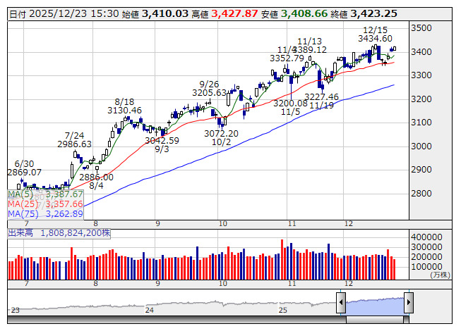 TOPIX <日足> 「株探」多機能チャートより日本取引所が公表した先物手口情報によると、12月23日のTOPIX先物期近(2026年3月限)の日中取引(立会内・J-NETの合算)で、取引高トップはABNクリアリン証券の1万4628枚だった。