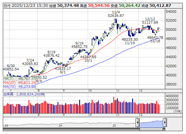 日経平均 <日足> 「株探」多機能チャートより日本取引所が公表した先物手口情報によると、12月23日の日経225先物期近(2026年3月限)の日中取引(立会内・J-NETの合算)で、取引高トップはABNクリアリン証券の1万1522枚だった。