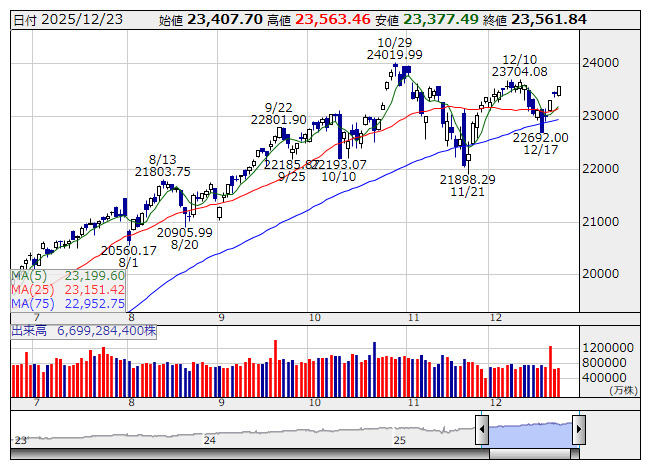 [NY市場データ]米国株式市場は続伸。ダウ平均は79.73ドル高の48442.41ドル、ナスダックは133.01ポイント高の23561.84で取引を終了した。金利高を嫌気し、寄り付き後、軟調に推移。その後、7-9月期の国内総生産(GDP)で消費が支援し2年ぶりの高成長となった結果を受け、景気に楽観的な見方が広がり相場を押し上げた。ハイテクも強く、終盤にかけ上げ幅を拡大し、終了。セクター別では半導体・同製造装置が上昇した一方、消費者サービスが下落した。シカゴ日経225先物清算値は大阪日中比85円高の50575円。ADR市場では、対東証比較(ドル156.12円換算)で、三菱UFJFG <8306>、ソニーG<6758>、東エレク<8035>などが上昇した。