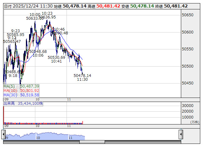 米株式市場の動向を横目に、24日の日経平均は62.61円高の50475.48円と続伸して取引を開始した。寄付き後は前日の米国株高を受けて買いが先行し、午前中の取引では一段の上値追いも見られたものの、薄商いの中で上値・下値を探る展開となった。為替市場では円相場がやや円安圏で推移し、輸出関連株の支援材料となった。セクター別では素材、電機など景気敏感株に買いが入り、需給面でも大型株中心に堅調な動きが見られた。ただ、年末を控えたポジション調整の動きも一部に散見されたため、マーケット全体の方向感にはやや慎重さが残った。
