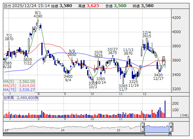 2025年12月24日15時15分 【材料】オークマ---反落、売出株の受渡期日を迎えて オークマ <日足> 「株探」多機能チャートより オークマ<6103>は反落。本日は売出株の受渡期日となっており、需給悪化が顕在化する状況となっているもよう。売出株数は500万株、売出価格は3365円となっている。売出決定から前日までの株価下落率は1.7%の水準であった。1月からは自社株買いがスタートするため、明日以降の需給改善期待は高く、安値水準からは下げ渋っている。なお、本日はTOAも自己株式処分の受渡期日を迎えて、売りが先行となっている。 《HM》 提供:フィスコ