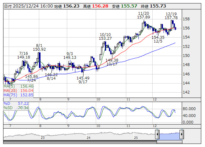 2025年12月24日16時01分 【通貨】外為:1ドル155円73銭前後とドル安・円高で推移 米ドル/円 <日足> Slowストキャス 「株探」多機能チャートより 24日の外国為替市場のドル円相場は午後4時時点で1ドル=155円73銭前後と、前日午後5時時点に比べ33銭のドル安・円高。ユーロ円は1ユーロ=183円69銭前後と7銭の小幅なユーロ安・円高で推移している。 株探ニュース