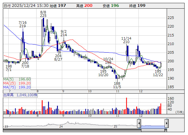 RIZAP <日足> 「株探」多機能チャートよりRIZAPグループ<2928>は23日、SOMPOホールディングス<8630>と共同で、社員約11,000人を対象とした健康実証研究プロジェクト「SOMPOチョコ活!」を2026年1月1日より開始すると発表した。