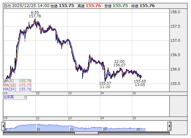2025年12月25日14時01分 【通貨】外為:1ドル155円74銭前後と小幅なドル安・円高で推移 米ドル/円 <5分足> 「株探」多機能チャートより 25日の外国為替市場のドル円相場は午後2時時点で1ドル=155円74銭前後と、前日午後5時時点に比べ8銭の小幅なドル安・円高。ユーロ円は1ユーロ=183円40銭前後と23銭のユーロ安・円高で推移している。 株探ニュース