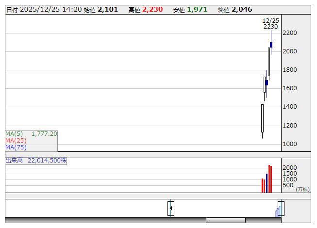 PowerX <日足> 「株探」多機能チャートより19日に東証グロース市場に新規上場した銘柄。この日は午前11時ごろに同社の蓄電システムが、関西電力<9503>が法人向けに提供する「蓄電池オンサイト導入サービス」に採用されたと発表し注目された。