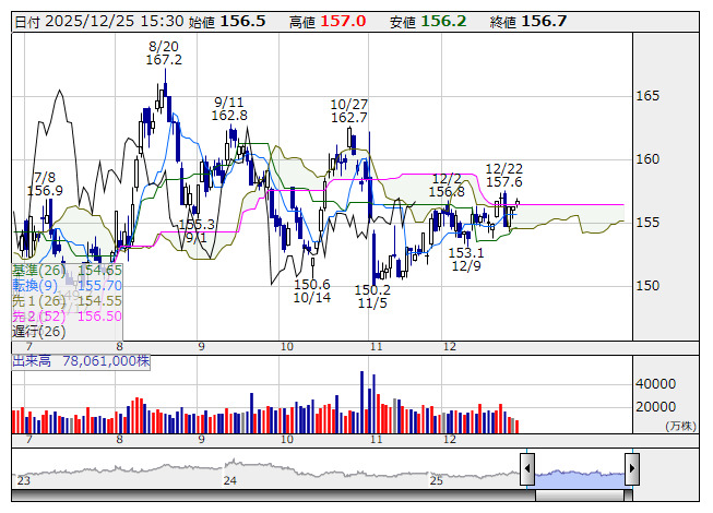 NTT <日足> 一目均衡表 「株探」多機能チャートより●一目均衡表の【雲】上抜け銘柄(市場人気順) ★2つの先行スパンに挟まれた上値抵抗帯を上抜けた銘柄