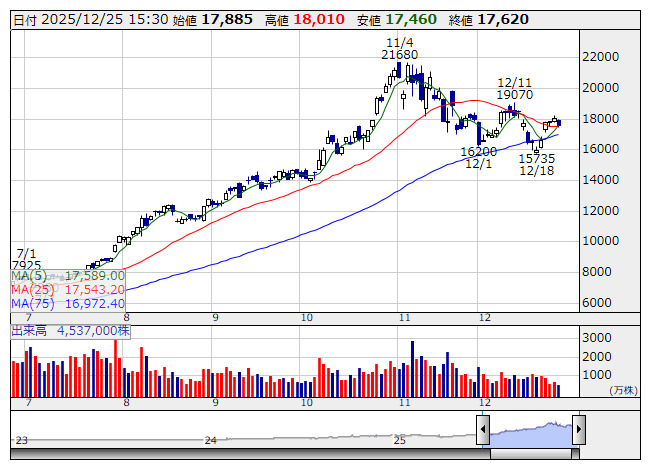 <5803> フジクラ 17620 -450 ( -2.5%) 17589.0 17543.2