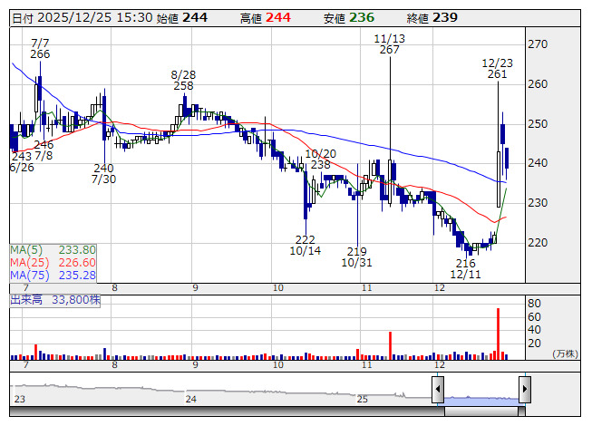 2025年12月25日18時40分 【市況】本日の【増資・売り出し】銘柄 (25日大引け後 発表分) 田谷 <日足> 「株探」多機能チャートより ○田谷 <4679> [東証S] L&Y貿易など2先を割当先とする120万株の第三者割当増資を実施する。発行価格は225円。 [2025年12月25日] 株探ニュース