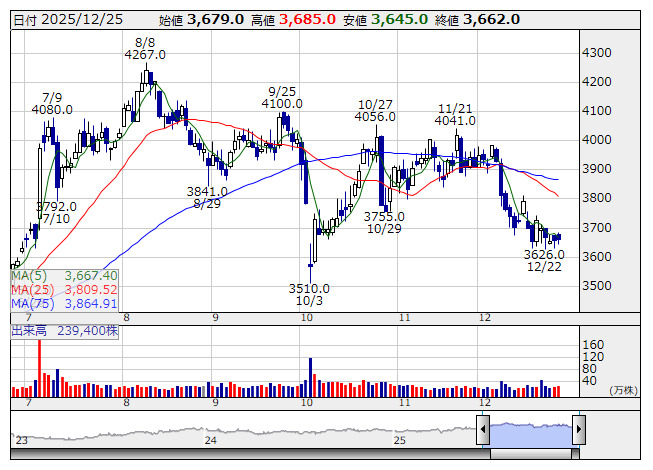 クスリアオキ <日足> 「株探」多機能チャートより12月25日の引け後に決算を発表した銘柄のなかから、業績好調や配当増額など市場で評価される可能性の高い銘柄を取り上げた。