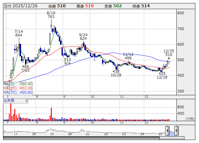 農業総研 <日足> 「株探」多機能チャートより12月26日9時03分39秒現在、特別買い気配は18銘柄、特別売り気配は2銘柄となっている。