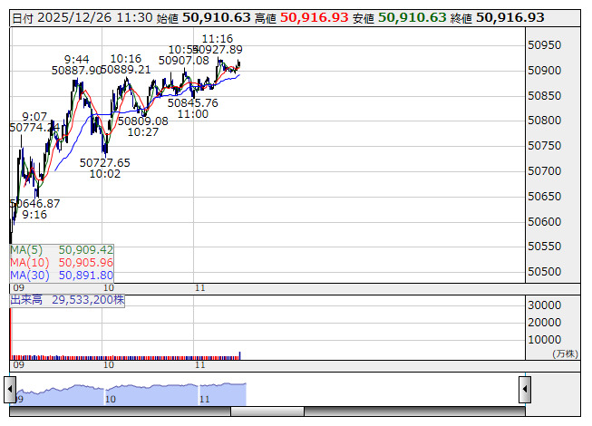 前日25日の主要欧米株式市場は休場。昨日の主要欧米株式市場が休場で手掛かり材料に乏しい中、26日の日経平均は119.34円高の50527.13円と続伸して取引を開始した。その後も買い優勢の展開となり上げ幅を大きく広げ、50900円を超えて前場の取引を終了した。引き続き、年内の少額投資非課税制度(NISA)枠利用に伴う個人投資家の買いや12月決算銘柄の配当権利取り狙いの買いが株価下支え要因となった。また、年内の警戒材料はほぼ出尽くしたとして、「掉尾の一振」に期待する買いも指摘された。