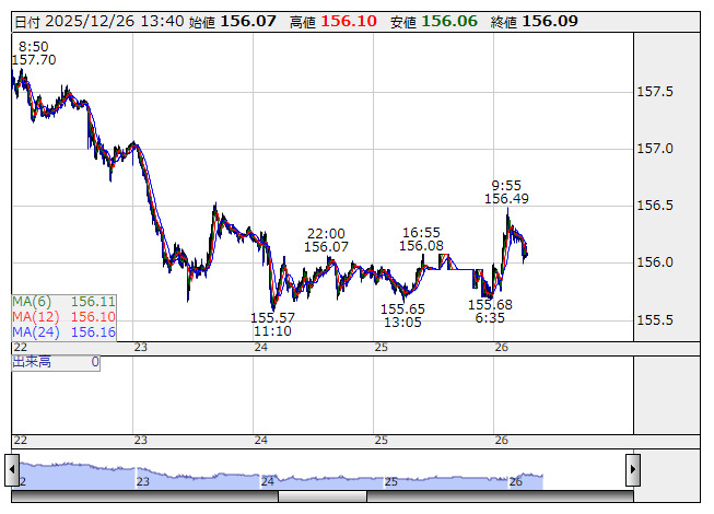 米ドル/円 <5分足> 「株探」多機能チャートより26日午後の東京市場でドル・円は小動きとなり、156円付近でのもみ合いが続く。日経平均株価は前日比約400円高の50800円台で推移し、日本株高を好感した円売りに振れやすい。ただ、156円台では日本の円安牽制が意識され、ドルの上値は重い。