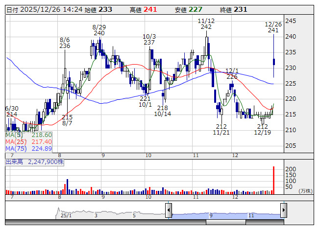 2025年12月26日14時25分 【材料】アルピコHD---大幅続伸、株主優待制度の導入を発表 アルピコHD <日足> 「株探」多機能チャートより アルピコHD<297A>は大幅続伸。株主優待制度の導入を発表している。3月末の500株以上保有株主が対象。500株以上1000株未満株主には、デリシア・アルピコホテルズ共通優待券2000円分(500円×4)、1000株以上株主には、デリシア・アルピコホテルズ共通優待券5000円分(500円×10)と鉄道上高地線(松本駅~新島々駅)片道乗車券710円相当×2枚を贈呈する。投資魅力の向上などを導入の目的としている。 《HM》 提供:フィスコ