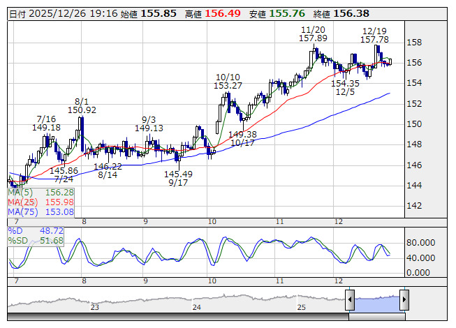 米ドル/円 <日足> Slowストキャス 「株探」多機能チャートより欧州市場でドル・円は小動きとなり、156円30銭から156円44銭のレンジ内でのもみ合いが続く。米10年債利回りの上昇一服でドル買いは後退し、ユーロ・ドルは1.1780ドルを目指す展開。ユーロ・円は上値が重いものの、184円前半を維持する。