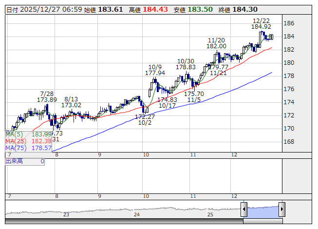今週のユーロ・円は伸び悩み。週初に185円に迫る場面があったが、日本政府による為替介入に対する警戒感が高まったことや日本銀行は2026年も複数回の利上げを行うとの見方が広がり、リスク選好的なユーロ買い・円売りは縮小した。欧州中央銀行(ECB)が来年中に利上げを開始するとの見方がやや後退したこともユーロ買い・円売りを抑制したようだ。取引レンジ:183円28銭-184円92銭。