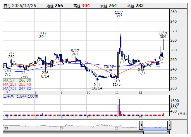 マイネット <日足> 「株探」多機能チャートより12月22日~26日に、通期業績を上方修正した銘柄から、経常利益の上方修正率の高い順に記した。なお、黒字転換や赤字縮小は除いた。
