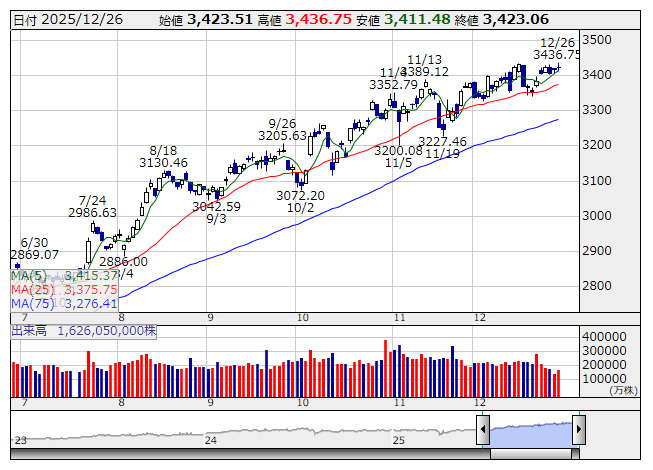 2025年12月29日08時46分 【市況】TOPIX先物:29日寄り付き=7.5ポイント高、3431ポイント TOPIX <日足> 「株探」多機能チャートより 29日8時45分、TOPIX先物期近2026年3月限は前週末清算値比7.5ポイント高の3431ポイントで寄り付いた。前週末のTOPIXの現物終値3423.06ポイントに対しては7.94ポイント高。 株探ニュース