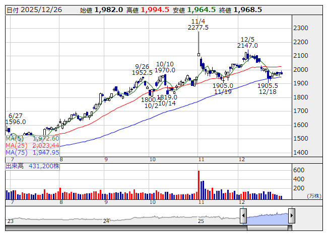 物色としてはソフトバンクGの動向を睨みつつ、半導体・AI関連株への資金流入が意識されやすいだろう。また、8月高値をピークに調整が続いていたグロース250指数は、ようやくリバウンドをみせてきている。上値を抑えられていた25日線を突破してきたこともあり、中小型株への個人投資家主体による資金流入が意識されそうだ。足もとで年初来高値を更新してきたトライアル<141A>やノースサンド<446A>、リブ・コンサルティング<480A>、FUNDINNO<462A>、ミーク<332A>、パワーエックス<485A>、BuySell Technologies<7685>などは引き続き関心が集まりやすい。