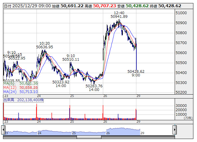 2025年12月29日09時03分 【市況】日経平均の下げ幅が300円を超える 日経平均 <5分足> 「株探」多機能チャートより 日経平均株価の下げ幅が300円を超えた。9時2分現在、321.77円安の5万428.62円まで下落している。 株探ニュース