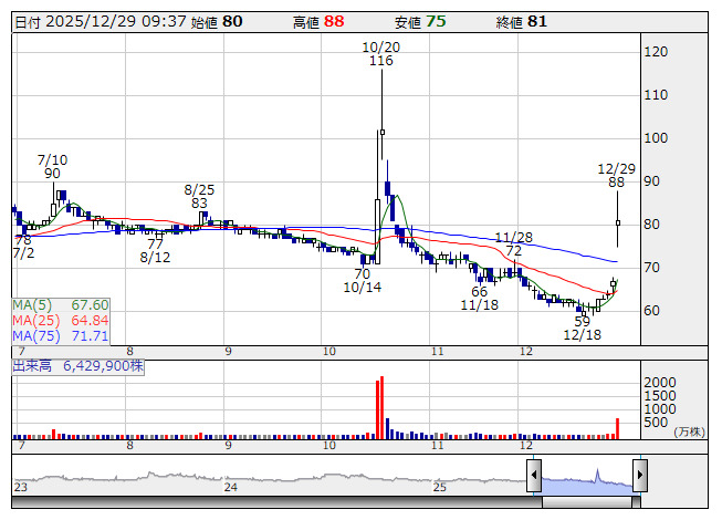 3113>は急動意。前週末26日取引終了後、UNIVA Marketing Limited(Cayman)(UMKY、ケイマン諸島)の子会社化について今後検討を進めることについて、UMKYの親会社との間で基本合意書を締結すると発表した。UMKYは傘下でナチュラリープラスブランドを主力製品とする栄養機能食品とビューティケア製品の販売会社向け供給などを手掛ける。今回の株式取得は、UNIVAグループの主力事業の一つであるビューティ&ヘルスケア事業を拡大する狙いがある。これが材料視されているようだ。