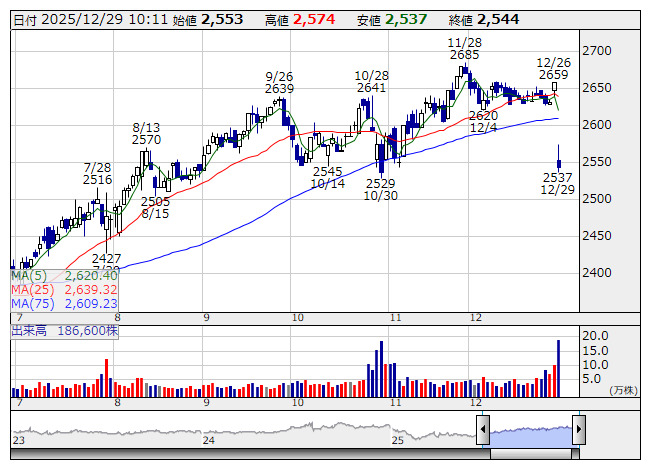 4784>といった12月期決算銘柄に安いものが目立つ。きょう29日は12月期末の配当と株主優待の権利落ち日にあたることから、処分売りの動きが優勢となっているようだ。