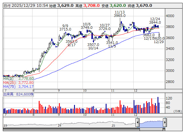 4631>は大幅続落。本日は12月末の配当優待・権利落ち日となっている。同社は年間配当金200円を計画(うち12月末150円)、先週末終値をベースとした配当利回りは5.3%の水準であった。200円のうち80円は特別配当であり、26年12月期の配当水準がやや不透明なことは余分売り圧力をやや強めさせてもいるとみられる。なお、同社のほか、マーケットエンタ、サンアスタリスク、FIG、ロイヤルHD、セグエなども権利落ちで売り優勢。