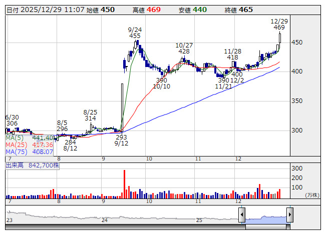 2025年12月29日11時08分 【材料】エニグモ---大幅続伸で高値更新、1月末高配当利回り銘柄として関心も エニグモ <日足> 「株探」多機能チャートより エニグモ<3665>は大幅続伸で9月以来の高値更新。本日は12月決算企業の配当権利落ち日となっているが、それに伴って、1月高配当利回り銘柄として関心が集まってもいるようだ。同社ではBUYMA20周年記念配当を加え、26年1月期、27年1月期は30円配当を実施するとしており、前日終値ベースでの配当利回りは6.7%の水準となっている。なお、同社は株主優待も実施しており、1月末は継続保有の要件になってくる。 《HM》 提供:フィスコ