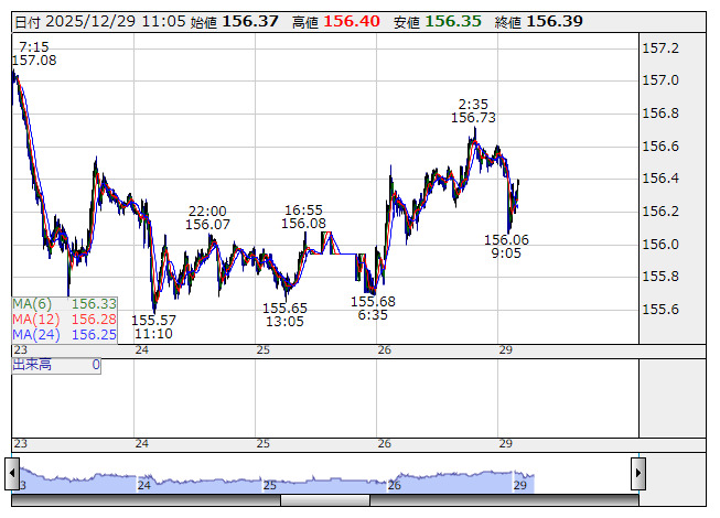 米ドル/円 <5分足> 「株探」多機能チャートより29日午前の東京市場でドル・円は156円30銭台で推移。156円58銭から156円06銭まで売られており、日本の財政悪化を警戒した円売りは一服。ただ、有力な売買材料は少ないこと、顧客筋の米ドル買い注文が156円近辺に残されているため、米ドル・円は156円台前半で下げ渋っている。ユーロ・円は184円40銭から183円81銭まで値下がり。ユーロ・ドルは下げ渋り、1.1765ドルから1.1786ドルまで戻す展開。