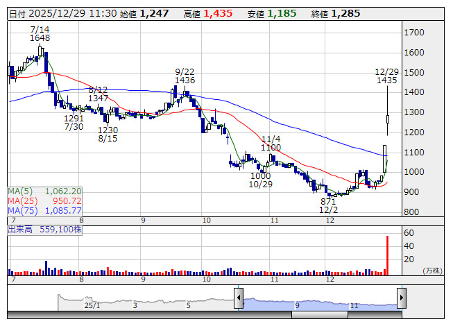 一方、インフォメティス<281A>、グランディーズ<3261>、フラー<387A>、スタートライン<477A>、リブ・コンサルティング<480A>など7銘柄が年初来安値を更新。ビートレンド<4020>、富士山マガジンサービス<3138>、G-FACTORY<3474>、スタメン<4019>、リベロ<9245>は値下がり率上位に売られた。