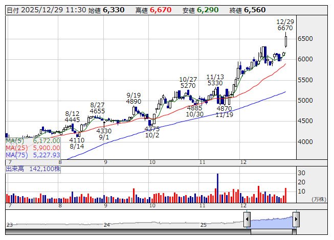 ゼット<8135>=動兆しきり。一時8%超の上昇で530円まで上昇する場面があった。スポーツ用品卸売の大手で、野球用品については自社製品を取り扱っていることもありWBC(ワールド・ベースボール・クラシック)関連株の一角として、折に触れ短期資金のターゲットとなりやすい。来年は3月にWBCの開催が予定されるが、日本の連覇が期待されるだけに盛り上がりをみせそうであり、それに先立って足もとで同社株の人気を先取りする動きが出ているようだ。市場では「(ゼットの)今上期の営業利益は計画ラインに届かず株価に下押し圧力が働いたが、業界の老舗企業でその点は安心感がある。PERやPBR、配当利回りなどバリュエーション面でも割安感が強い」(中堅証券ストラテジスト)という見方が示されていた。中低位材料株としての特性から株価の上下動は荒いものの、長期的な視点に立ってここ約2年間にわたり下値切り上げ波動が続いていることは注目される。