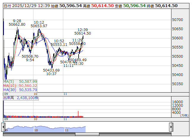 米株市場を横目に、29日の日経平均は前営業日比59.17円安の50691.22円と反落でスタート。やや売りが先行した後は、50500円付近で軟調もみ合い展開となった。2025年相場もあと2営業日となるなか、市場参加者は限られている。値がさハイテク株などの主力どころが弱く始まったこともあり、寄り付き後に下げ幅を広げたが、その後は下げ渋った。なお、トランプ米大統領とウクライナのゼレンスキー大統領との会談については、和平案に絡んだ領土問題で合意に至らなかったと伝わっている。