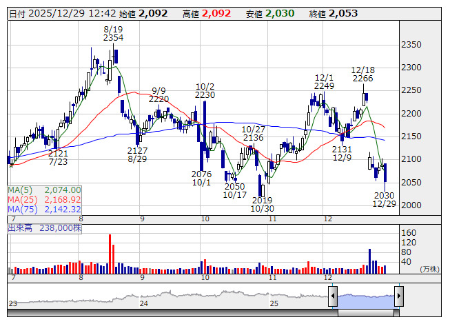 2025年12月29日12時43分 【材料】西松屋チェが後場下げ幅を拡大、秋冬物衣料品苦戦で26年2月期業績予想を下方修正 西松屋チェ <日足> 「株探」多機能チャートより 西松屋チェーン<7545>が後場下げ幅を拡大している。正午ごろに、26年2月期の連結業績予想について、売上高を2000億円から1930億円へ、営業利益を136億円から93億円へ、純利益を93億500万円から61億5000万円へ下方修正したことが嫌気されている。 今期から連結決算に移行したため前期との単純比較はできないものの、秋冬物の衣料品の販売苦戦が下方修正の主な要因としている。また、衣料品の滞留在庫を前倒しで処分したことで値下げロス額が増加する見込みであることも響くとしている。 出所:MINKABU PRESS