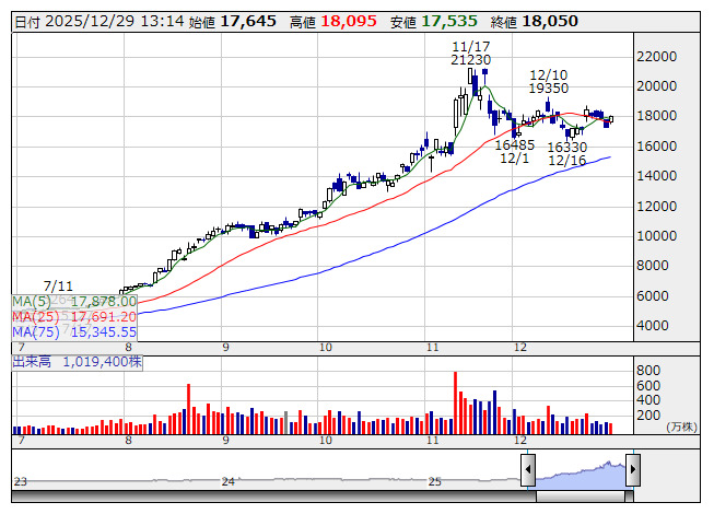 三井金属 <日足> 「株探」多機能チャートより29日の東証プライム市場で、三井金属が5日ぶりに反発。同社の株価は昨年末に比べ3.8倍の水準にあり、25年の大化け銘柄となった。非鉄大手である同社はAI向けデータセンターのサーバーなどに使われる「VSP」と呼ばれる銅箔の需要が拡大しており、AI関連株物色の流れに乗った。株価は11月に2万1230円の最高値をつけた後は、一服局面にあるが、銅などの価格は上昇基調にあり再人気化の期待も膨らんでいる。ただ、足もとでは高値警戒感も台頭している様子だ。