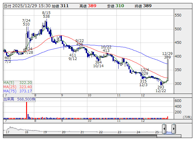 WASHハウ <日足> 「株探」多機能チャートよりマルマエ<6264>=上げ足強め7連騰。年初来高値に急接近した。前週末26日の取引終了後、26年8月期第1四半期(9~11月)の連結決算を発表した。売上高は42億4400万円、営業利益は7億100万円となり、営業利益は中間期の計画に対して進捗率が58%と順調だった。半導体向けで好調さを維持しており、見直し買いが加速したようだ。同社は4月にKMアルミニウムを子会社化し、25年3~5月期より連結決算に移行した。単独決算で前年同期となる25年8月期第1四半期(9~11月)は、売上高が19億1100万円、営業利益が4億4400万円。単純比較はできないものの前年同期の水準に対し、今回発表の売上高は2.2倍、営業利益は58%増となる。精密部品事業ではフラットパネルディスプレイ(FPD)向けが低調となったが、主力の半導体分野では納期の前倒し要求が出始めて数量も増加傾向にあるという。機能材料事業も半導体工場の高稼働などを背景に想定よりも好調に推移し、同事業においてIT器材分野ではメモリー向けも伸長したとしている。