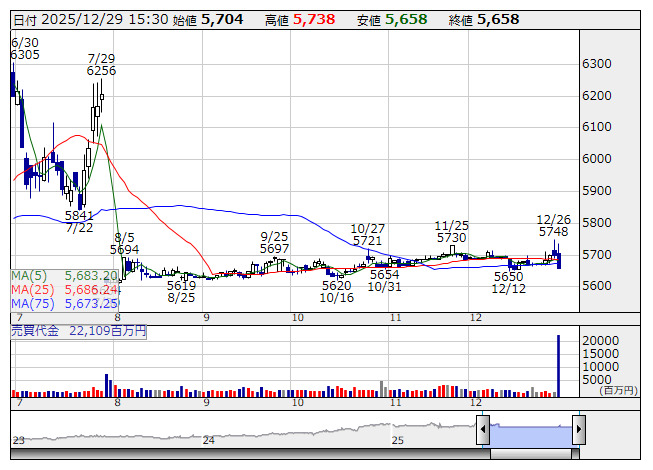 1. <6406> フジテック 5,658 ( -0.7%) 22,109 ( 52.9倍)