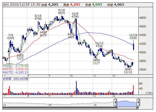 ストップ高。生命保険協会が認定する「認定代理店」へ復帰したと先週末に発表している。同社は24年9月期決算で債務超過となったことから、認定代理店としての認定の有効性がこれまで停止していた。12月17日に提出した25年9月期決算では債務超過を解消することができたため、評価の停止の措置が解除され、12月26日付で認定代理店へ復帰することになったもよう。買い安心感が強まる展開になっている。