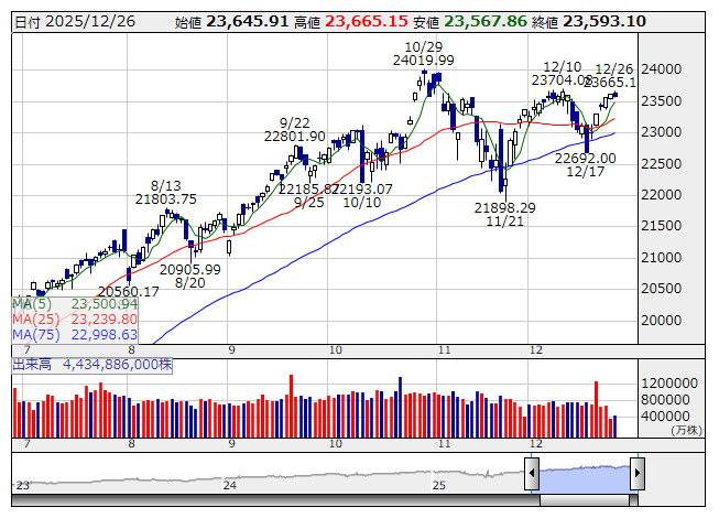 26日の米国株式市場でダウ平均は20.19ドル安の48710.97ドル、ナスダックは20.21ポイント安の23593.10で取引を終了。クリスマス祭日明けで材料乏しく、寄り付き後、まちまち。金利高や地政学的リスクの上昇を警戒し、ダウは下落した。ナスダックは、エヌビディア(NVDA)の上昇がけん引し、終日底堅く推移したが、プラス圏を維持できず。