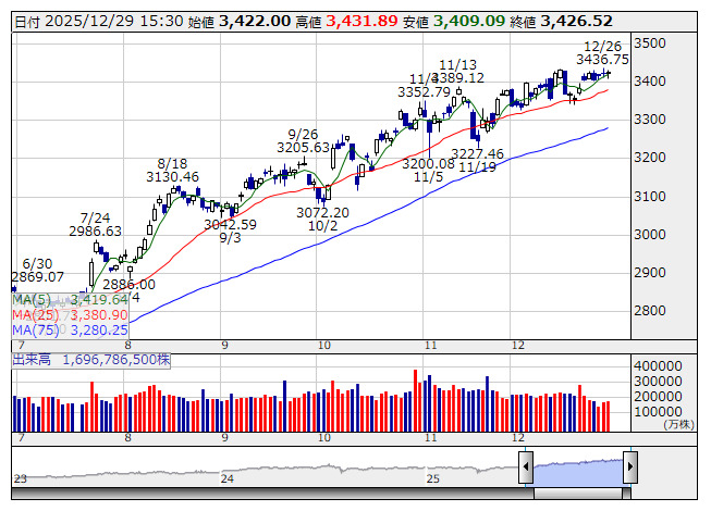 TOPIX <日足> 「株探」多機能チャートより日本取引所が公表した先物手口情報によると、12月29日のTOPIX先物期近(2026年3月限)の日中取引(立会内・J-NETの合算)で、取引高トップはソシエテG証券の1万6280枚だった。
