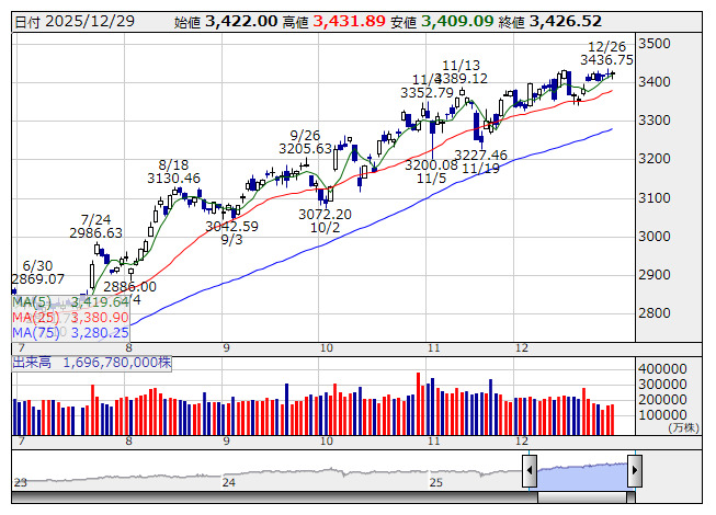 TOPIX <日足> 「株探」多機能チャートより3481.09ポイント ボリンジャーバンド3σ
