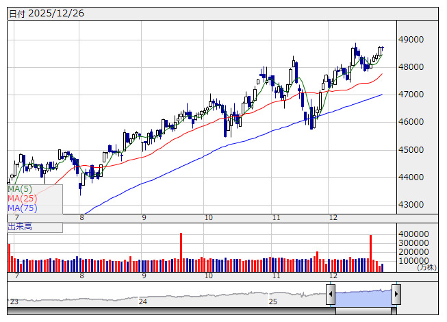 年末に向けた利益確定売りが先行したと見られ、寄り付き後、下落。トランプ大統領が実施したウクライナ、ゼレンスキー大統領との会談後の電話会談でロシアのプーチン大統領がウクライナにより大統領府が攻撃されたと主張したことがわかり、和平案締結の期待後退でさらに売られ、終日軟調に推移し終了した。セクター別ではエネルギーが上昇した一方、自動車・自動車部品が下落。