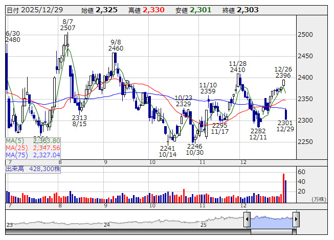 アルペン <日足> 「株探」多機能チャートより銘柄名<コード29日終値⇒前日比