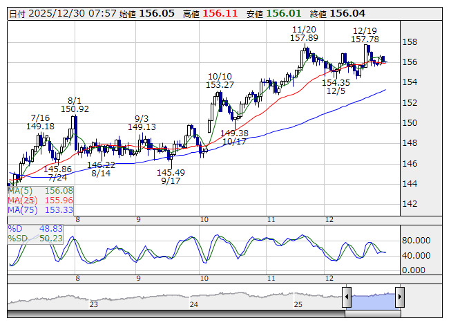 米ドル/円 <日足> Slowストキャス 「株探」多機能チャートより29日の米ドル・円は、東京市場では156円58銭から156円05銭まで下落。欧米市場では156円42銭まで買われた後、155円92銭まで反落し、156円05銭で取引終了。本日30日の米ドル・円は主に156円を挟んだ水準で推移か。米国株安を意識してリスク選好的な米ドル買い・円売りは抑制される可能性がある。
