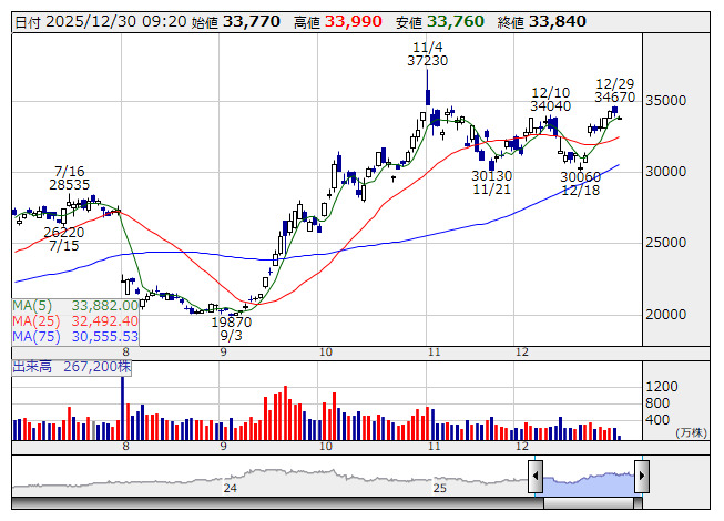 5ポイント安の23474.35で取引を終了した。年末に向けた利益確定売りが先行したと見られ、寄り付き後、下落。トランプ大統領が実施したウクライナ、ゼレンスキー大統領との会談後の電話会談でロシアのプーチン大統領がウクライナにより大統領府が攻撃されたと主張したことがわかり、和平案締結の期待後退でさらに売られ、終日軟調に推移し終了した。