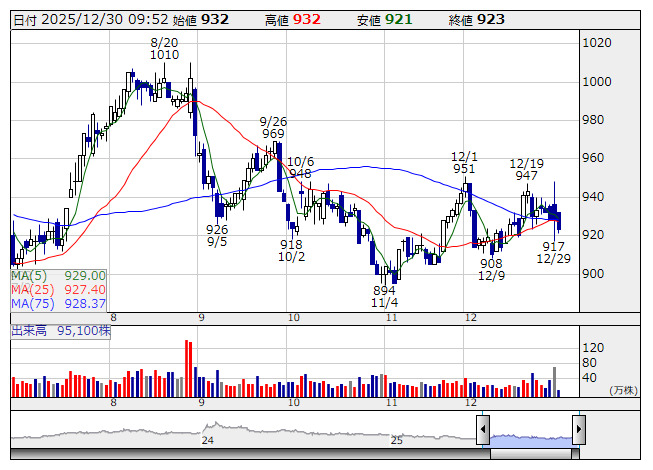 2025年12月30日09時52分 【材料】壱番屋は小安い、夜パフェ専門店の運営企業を子会社化 壱番屋 <日足> 「株探」多機能チャートより 壱番屋<7630>は小安い。29日取引終了後、夜パフェ専門店を運営するGAKU(札幌市)の全株式を取得し、連結子会社化すると発表した。新たな業態に展開することで企業価値向上を目指す狙いがあるとみられる。この発表に対する株価への反応は限定的となっている。 出所:MINKABU PRESS