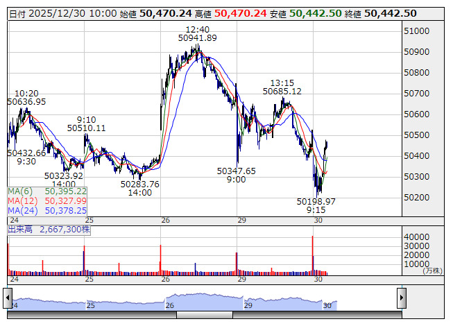 【市況】10時の日経平均は71円安の5万455円、中外薬が9.02円押し下げ
