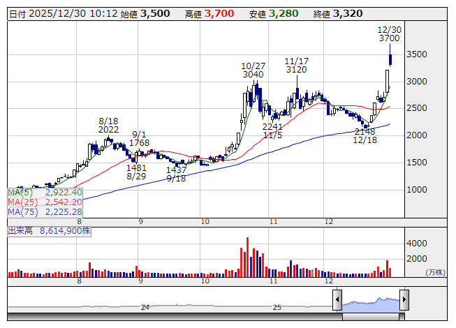東洋エンジ <日足> 「株探」多機能チャートより日中関係の悪化などを背景に、輸入ではなく国産で調達するレアアースの必要性が高まっている。そのなか、海洋研究開発機構などが年明け(1月中旬)から南鳥島沖の深海底掘削により、レアアースを多く含む堆積物(レアアース泥)を試験採取することが明らかとなっている。東洋エンジは海洋研究開発機構の委託で深海底からレアアース泥を回収するシステムの技術開発に携わっており、同テーマの花形銘柄として市場の注目度が高い。また、官庁との取引が豊富ないであは、国土強靱化関連でも重要なポジションにあるが、海洋環境調査で実績の高い建設コンサル企業ということもあって、海洋資源開発プロジェクト(差し当たってはレアアース)に絡む有望株としての位置付けで人気化素地を開花させている。