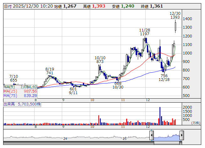 2025年12月30日10時19分 【材料】オンコリスは急騰で1カ月ぶり年初来高値、開発製品の承認に期待 オンコリス <日足> 「株探」多機能チャートより オンコリスバイオファーマ<4588>は急騰。11月28日につけた1197円を上回り、約1カ月ぶりに年初来高値を更新した。食道がん治療再生医療等製品として開発中の腫瘍溶解ウイルス「OBP-301」への期待が高まっているようだ。今月15日に同製品の製造販売承認申請を行ったことを発表。先駆的再生医療等製品指定制度に則り、申請後6カ月ほどで承認に至る見込みという。 出所:MINKABU PRESS