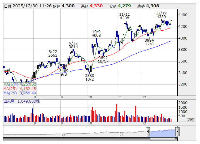 NVDA>との戦略的協業を拡大すると発表。12月24日には協業の成果として、フィジカルAIやAIエージェントをシームレスに連携させる技術を開発したと公表している。エヌビディアとの協業関係に加え、量子コンピューターをはじめとする先端技術領域や防衛分野など、多岐にわたる投資テーマに関連する銘柄とあって、2025年の富士通の株価は年初来で50%を超す上昇となった。株式市場において26年もフィジカルAIやAIエージェントといったテーマに投資家の関心が寄せられるとみられるなか、大納会のこの日は国内大手証券による投資判断と目標株価の引き上げの動きも手伝って、同社株への選好姿勢が強まったようだ。