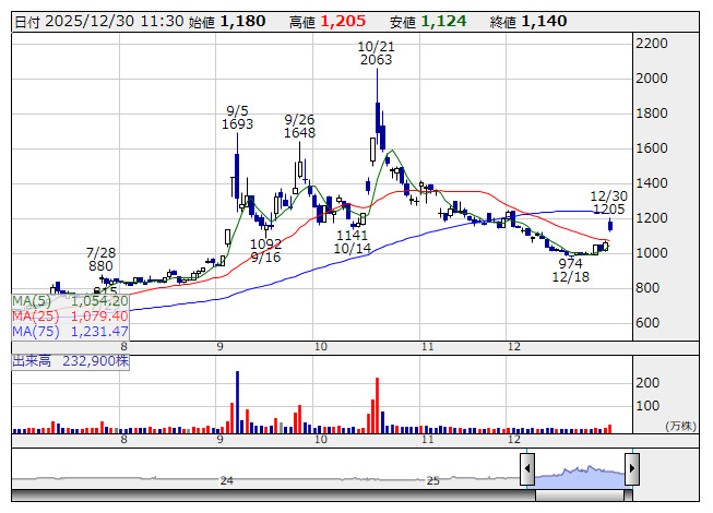 イトヨーギョ <日足> 「株探」多機能チャートよりオンコリスバイオファーマ<4588>=急騰、一気に新値街道復帰。11月28日につけた1197円を上回り、約1カ月ぶりに年初来高値を更新した。食道がん治療再生医療等製品として開発中の腫瘍溶解ウイルス「OBP-301」への期待が高まっているようだ。今月15日に同製品の製造販売承認申請を行ったことを発表。先駆的再生医療等製品指定制度に則り、申請後6カ月ほどで承認に至る見込みという。