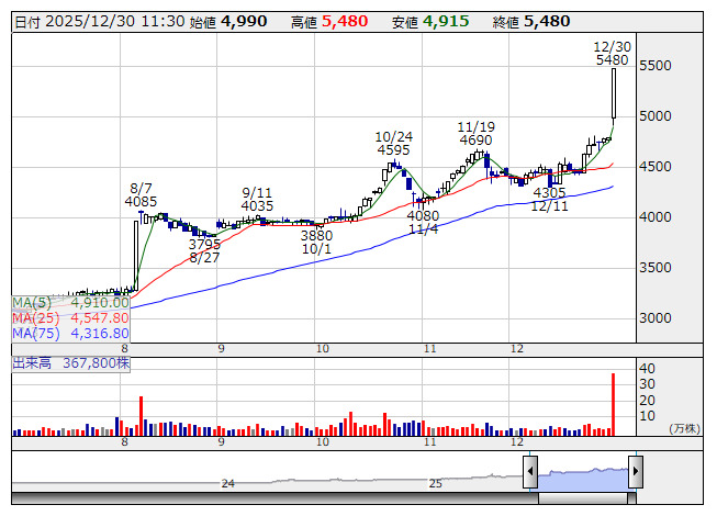 大幅続伸。投資有価証券売却益の計上を発表している。資産の効率化及び財務体質の強化を図ることが目的。保有している投資有価証券1銘柄の一部を前日に売却し、投資有価証券売却益598百万円を第4四半期の決算に計上予定としている。現在、25年12月期通期最終損益は1億円の黒字見通しであるが、今回の売却益計上による影響は、その他要因も含めて精査中としている。